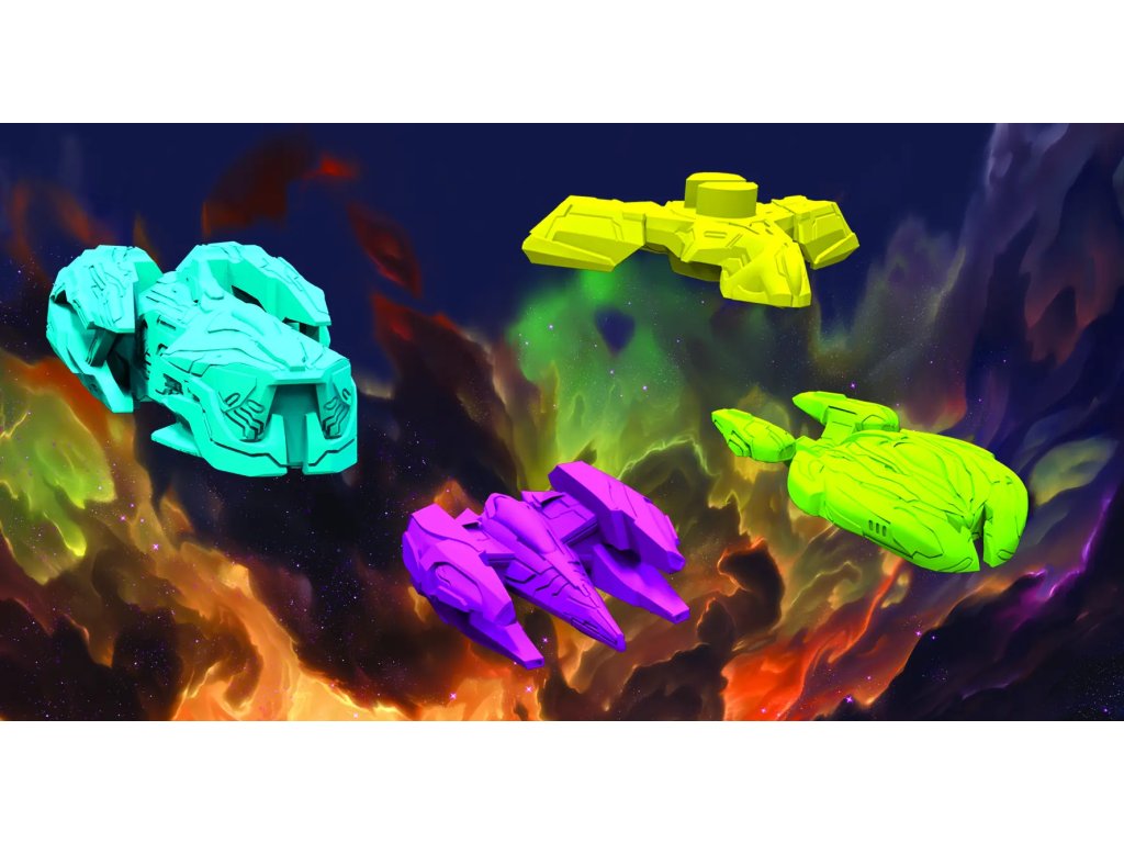 - Materiál hráčů:12 karet frakcí, 36 figurek lodí (9 v každé barvě), 24 šestistěnných kostek, 36 velitelů (9 v každé barvě), 4 panely stanice, 28 žetonů upgradu lodí, 24 ukazatelů skóre / pokroku