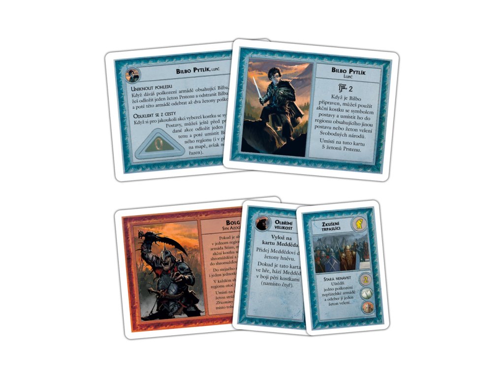 - 92 karet (30 karet událostí, 20 karet příběhu pro hráče za Stín, 20 karet příběhu pro hráče za Svobodné národy, 9 karet osudu a 13 karet