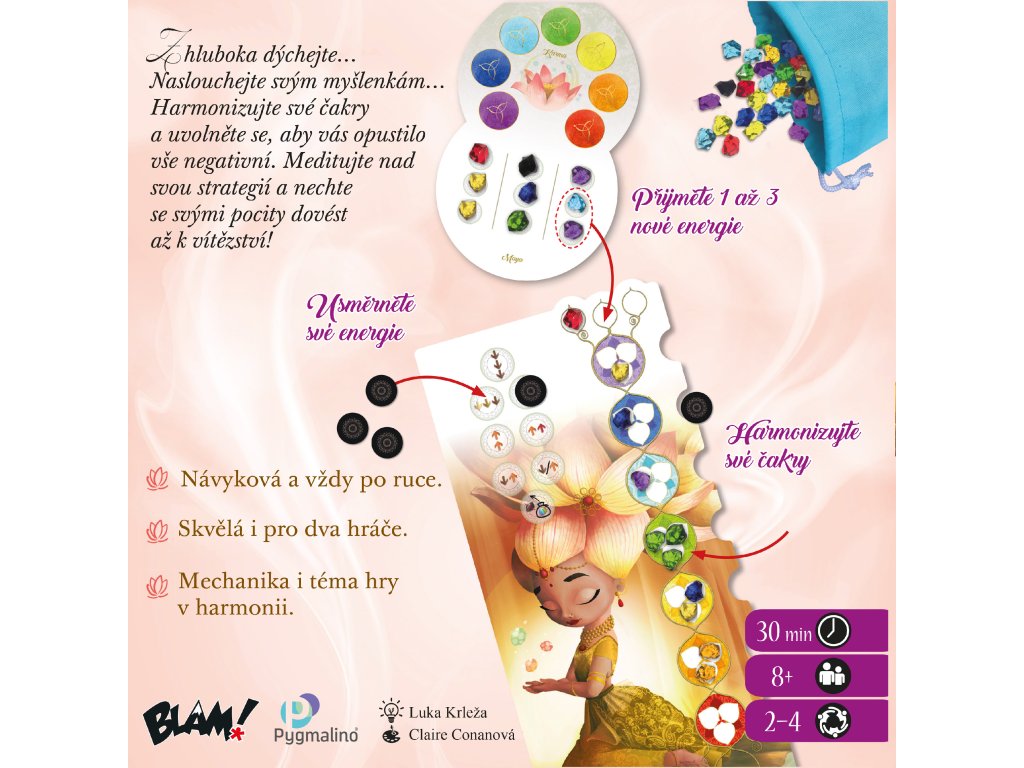 V průběhu hry hráči sbírají energii ve formě krystalů různých barev, které ukládají na své hrací ploše a následně je usměrňují, tedy přesouvají tak, aby harmonizovali své čakry. Hra končí, má-li některý z hráčů na konci herního kola alespoň pět harmonizovaných čaker. Závěrečné bodování pak určí vítěze – hráče s nejvyšší úrovní naplnění.