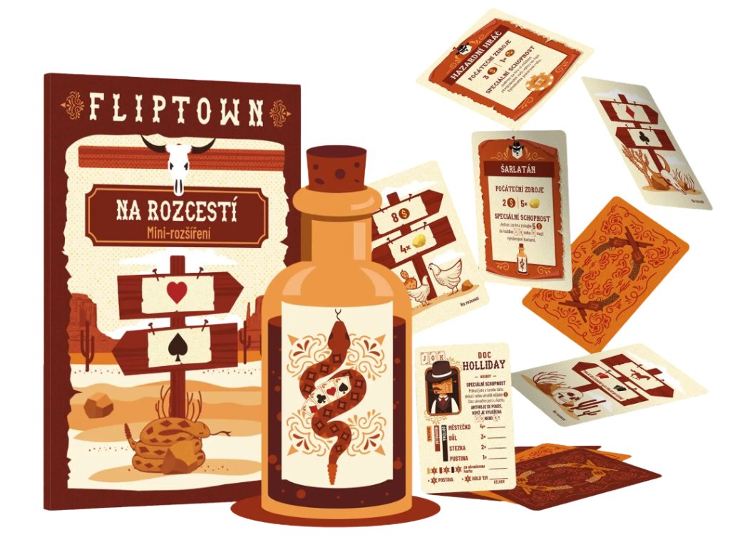 Fliptown: Na rozcestí je minirozšíření pro karetní flip & write hru Fliptown. Obsahuje sadu karet rozcestí, které rozšiřují hru o novou mechaniku rozhodování. Během hry se hráčům nabízejí různé možnosti, jak upravit svůj tah, změnit směr postupu nebo získat drobnou výhodu.