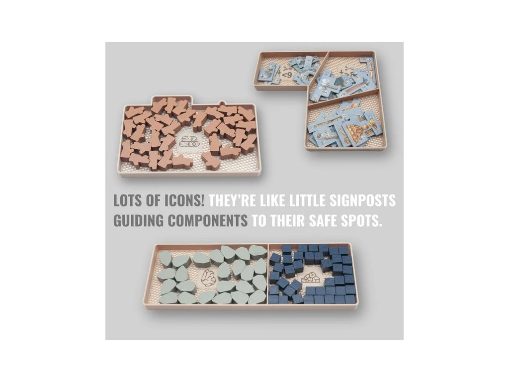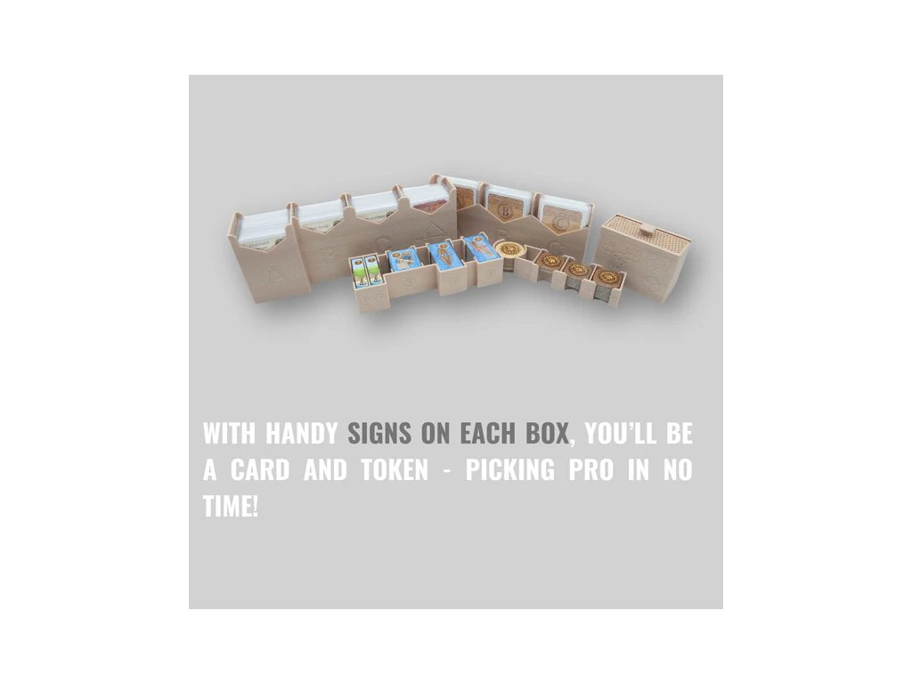 - Insert pojme základní hru i rozšíření Norové, včetně minirozšíření č. 1 a č. 2, přičemž vše je uloženo v krabici základní hry.