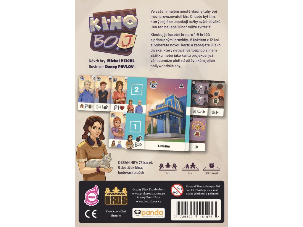 Kinoboj je karetní hra, ve které je cílem hráčů vytvořit to nejlepší kino! Hráči si rozebírají karty, které do svého kina můžou přiřadit jako diváky, kteří mají specifické požadavky, nebo naopak jako různé filmy, kterými mohou tyto požadavky naplňovat. Cílem je vytvořit ideální kombinaci diváků a filmů, která jim přinese nejvíce popcornu, tedy vítězných bodů! Kinoboj je hra s jednoduchými pravidly, vytvořit ty nejlepší kombinace ale často není snadné!