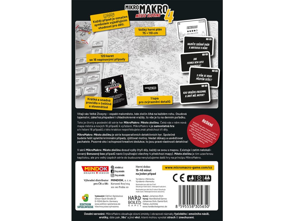 Toto je čtvrtý a poslední díl série her MikroMakro: Město zločinu. Čeká vás v něm nová mapa města a nových 16 případů k vyřešení. MikroMakro 4 je samostatná hra a k řešení 16 případů z této krabice nepotřebujete znát předchozí tři díly.