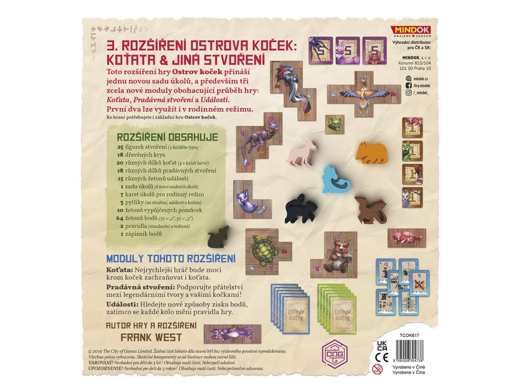 Ke hraní 3. rozšíření Ostrov koček: Koťata & jiná stvoření potřebujete i základní hru Ostrov koček. Toto rozšíření hry Ostrov koček přináší jednu novou sadu úkolů, a především tři zcela nové moduly obohacující průběh hry: Koťata, Pradávná stvoření a Události. První dva lze využít i v rodinném režimu.