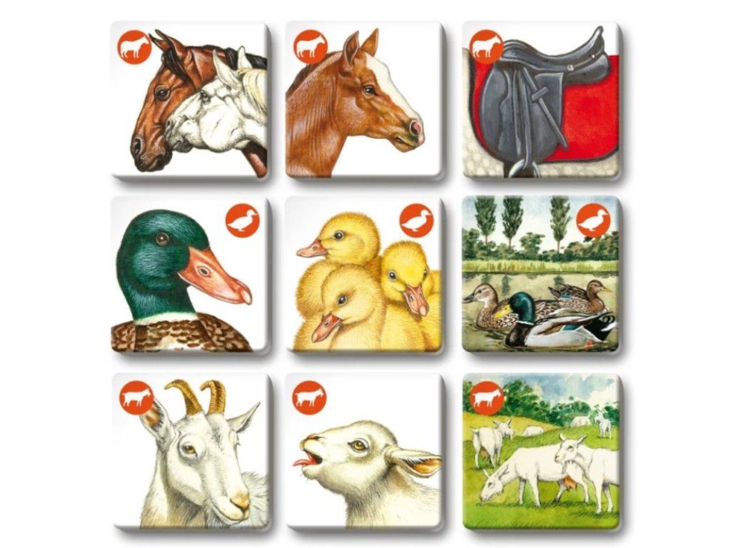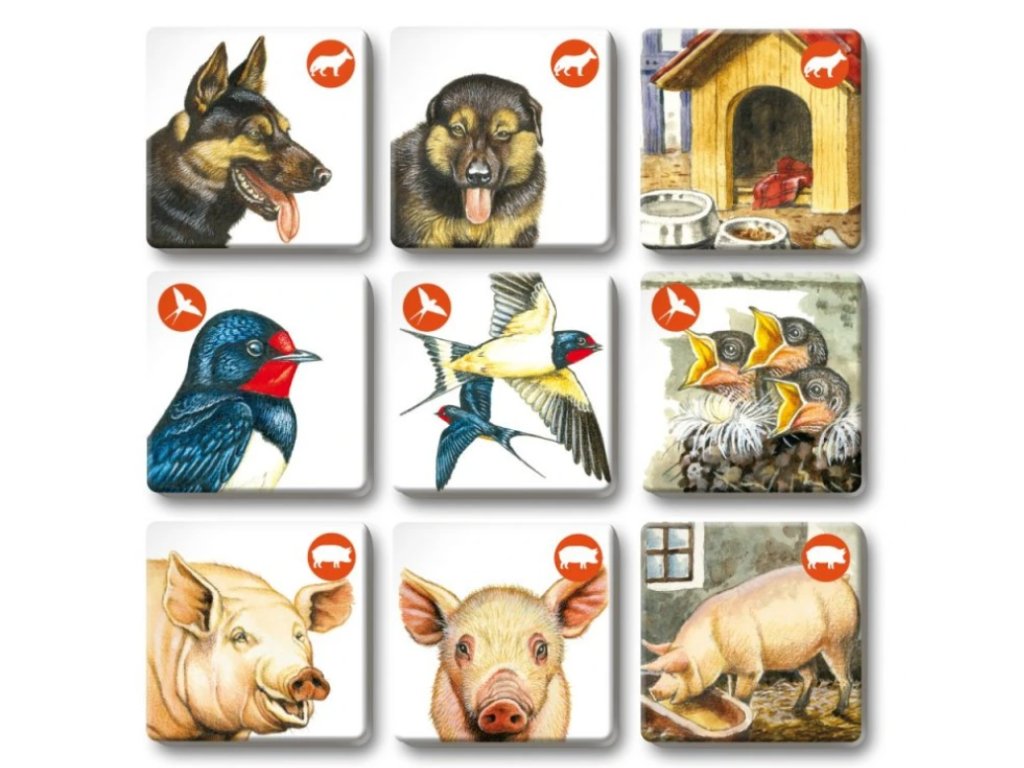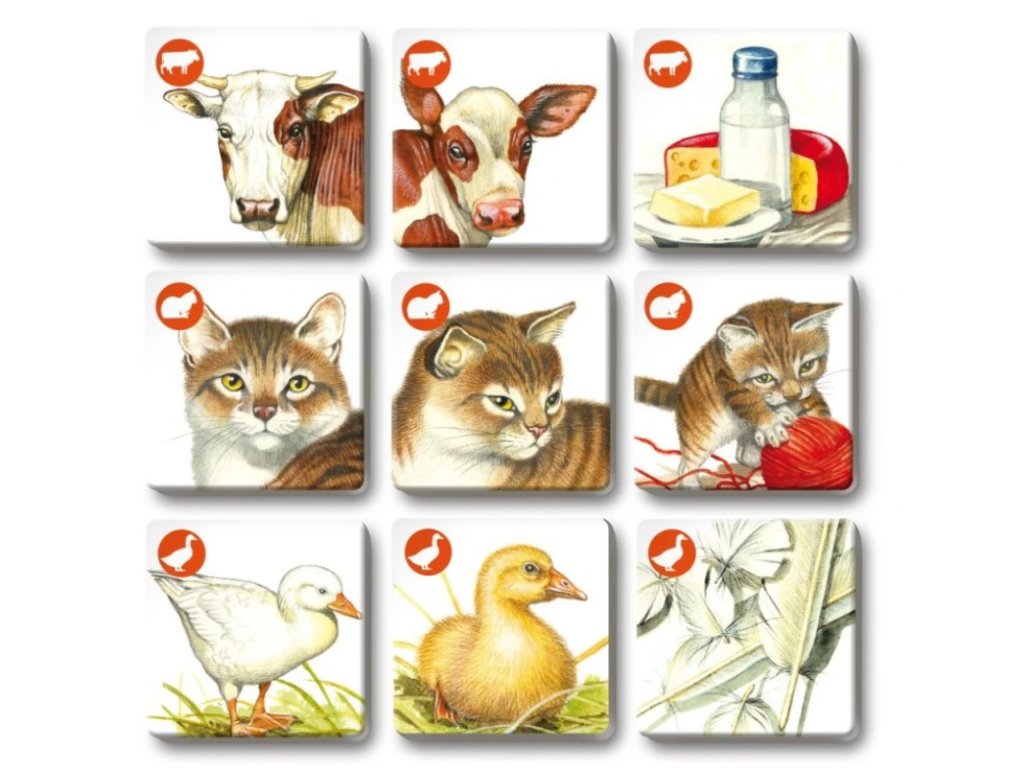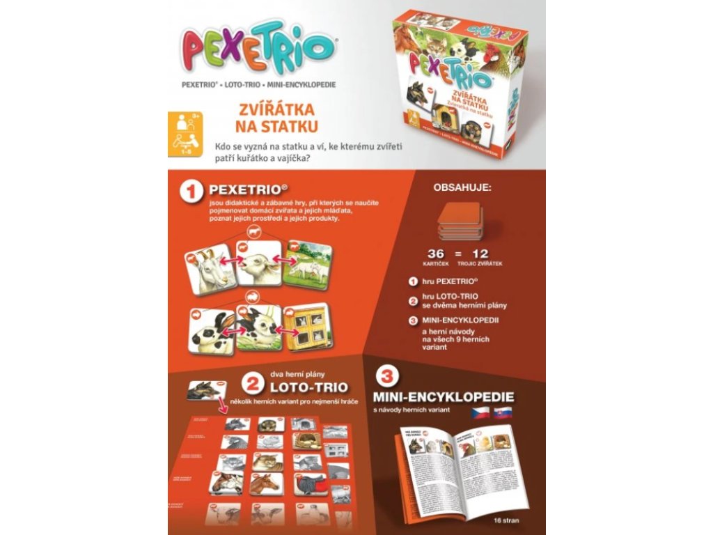 Pexetrio ZVÍŘÁTKA NA STATKU je výuková a zábavná hra, která vás naučí pojmenovat domácí zvířata a jejich mláďata, poznat jejich prostředí a jejich produkty. Obsahuje herní varianty pro nejmenší děti od 2-3 let, dále pro děti předškolního věku, školní děti, teenagery i dospělé hráče.