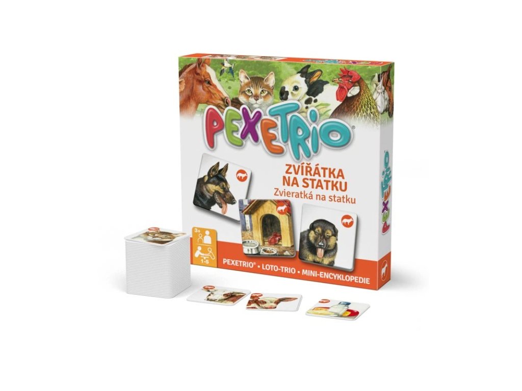 Pexetrio ZVÍŘÁTKA NA STATKU je zábavná hra inspirovaná pexesem, která děti zároveň i vzdělává. Děti se naučí pojmenovat domácí zvířata a jejich mláďata, poznat jejich prostředí a jejich produkty podle hesla „škola hrou“. Kromě toho, že si děti osvojí domácí zvířátka zábavným způsobem, hra také napomáhá rozvíjet jejich logické myšlení a trénovat paměť hledáním trojice kartiček s domácími zvířátky s jejich mláďaty, s prostředím kde žijí a jejich produkty.