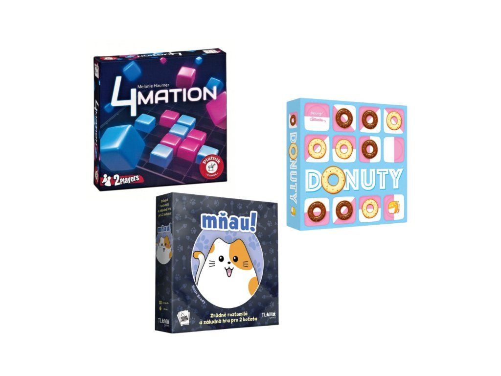 - Donuty - lahodná a taktická bitva. Náhodně poskládejte ze 4 destiček herní plán, dejte každému 15 donutů a hrajte. Každý tah určuje, kam může hrát protihráč. Vaším cílem je sestavit řadu 5 donutů a neumožnit soupeři, aby se vám do ní vměstnal se svými.