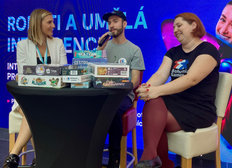 Součástí programu byly také rozhovory na pódiu. Ivča s Vaškem si s moderátorkou povídali o tom, jak deskové hry propojují kreativitu a logiku s technologiemi, a vysvětlovali, proč jsou hry nejen zábavou, ale i přirozeným způsobem rozvoje dovedností. Zaznělo, že hry umožňují trénovat myšlení podobné tomu, které stojí za AI nebo robotikou, a že sdílený zážitek u hry je silnější než samotné hraní.